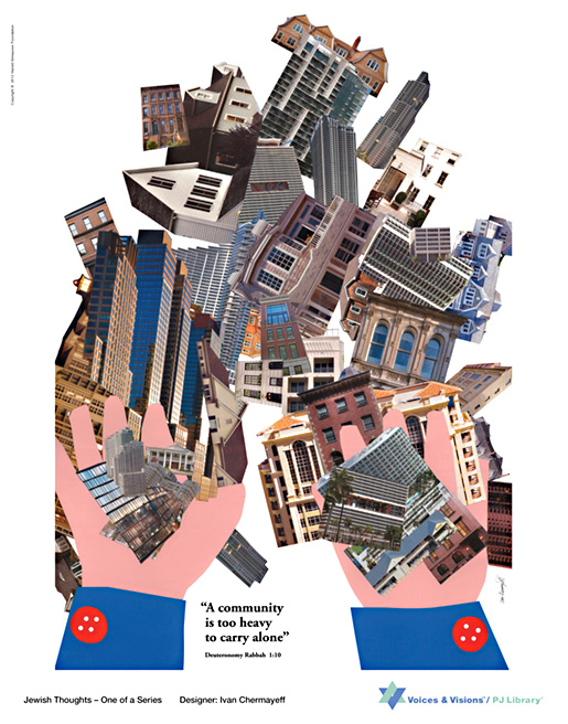 Years ago, as the Harold Grinspoon Foundation was developing the Jewish poster series “Voices & Visions,” we invited designer Ivan Chernmayeff to create an image to interpret this Midrashic teaching about community. Chernmayeff created a stunning collage of a large pair of hands holding up a multitude of buildings of all sizes and shapes. The hands are the visual center of the piece, strong, steady and outsized. They are supporting not only the buildings but also everything that happens within those buildings. Without the people behind those hands, there is no community.